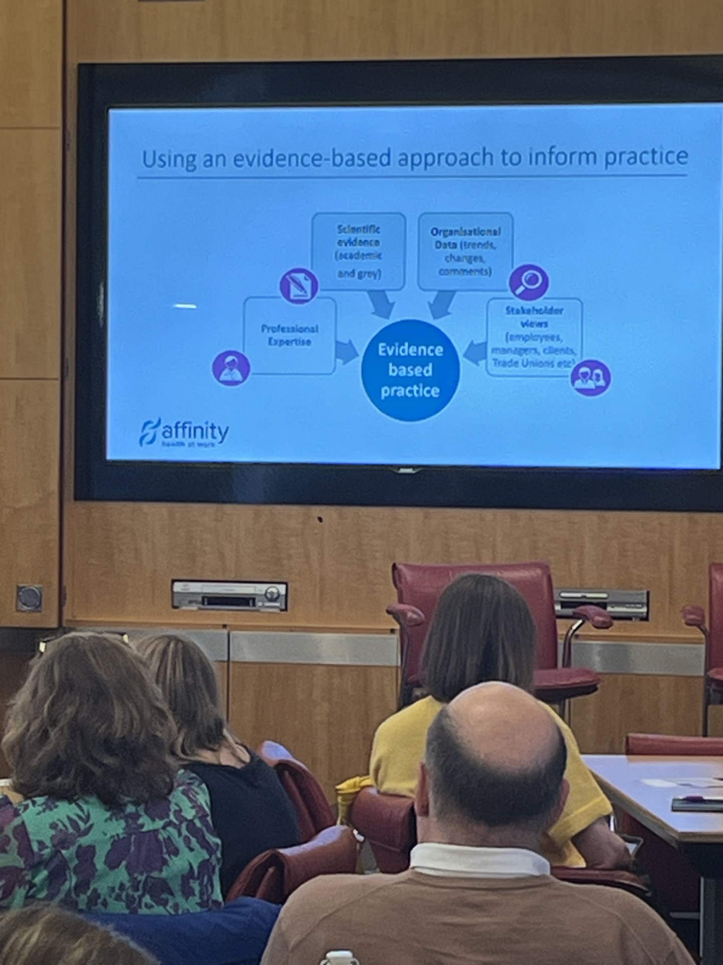 After a short break, Professor Jo Yarker led an interactive workshop focused on building an evidence-based vocational rehabilitation community. Drawing on the ENGAGE Project, Yarker guided attendees through real-world scenarios, encouraging collaborative thinking around what constitutes evidence, how it can be embedded into practice, and how practitioners can contribute to shaping future research.